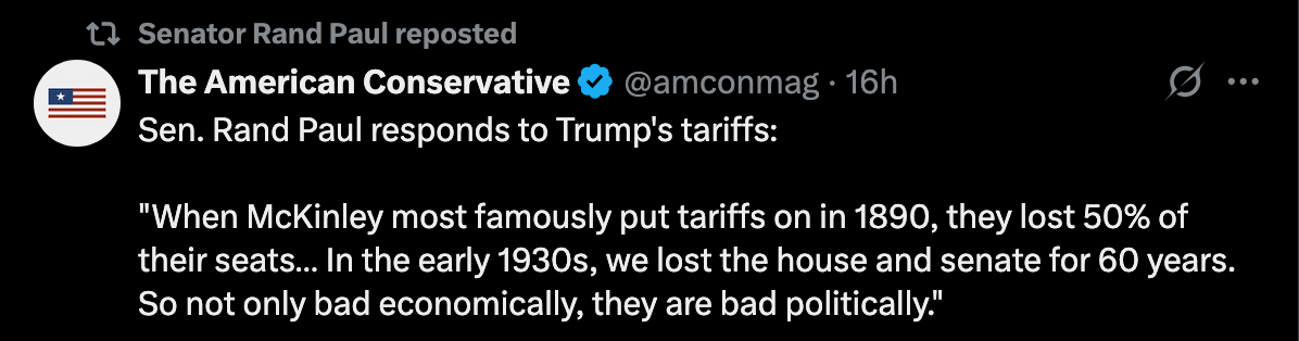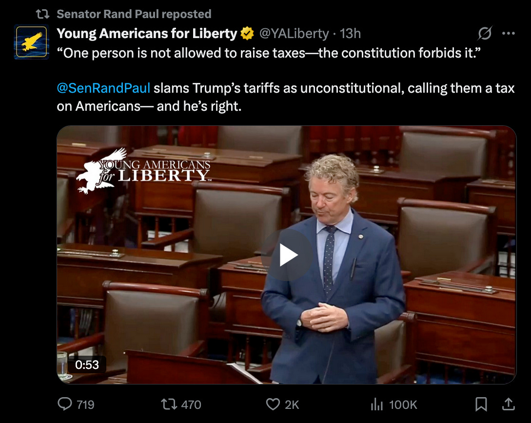Senator Rand Paul has gone on the offensive against the Trump administration’s tariffs, stating they are the act of “one person”: