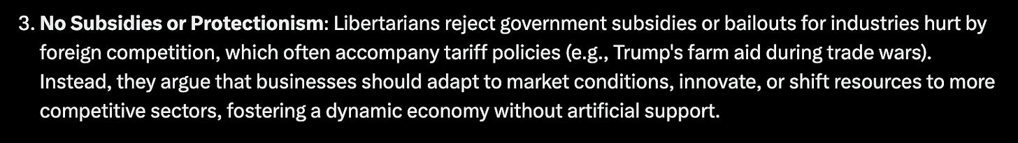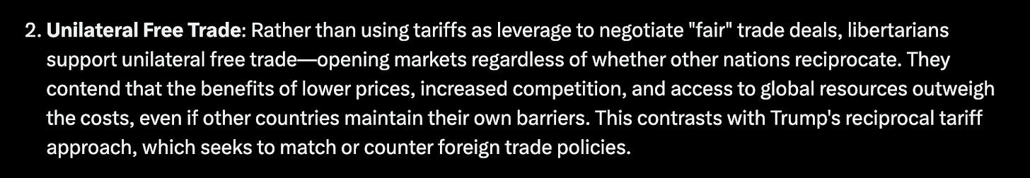 Let’s zoom in a bit on the main libertarian arguments against tariffs. From Grok: