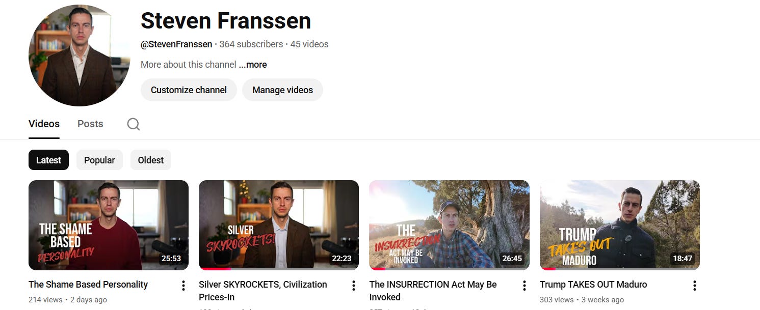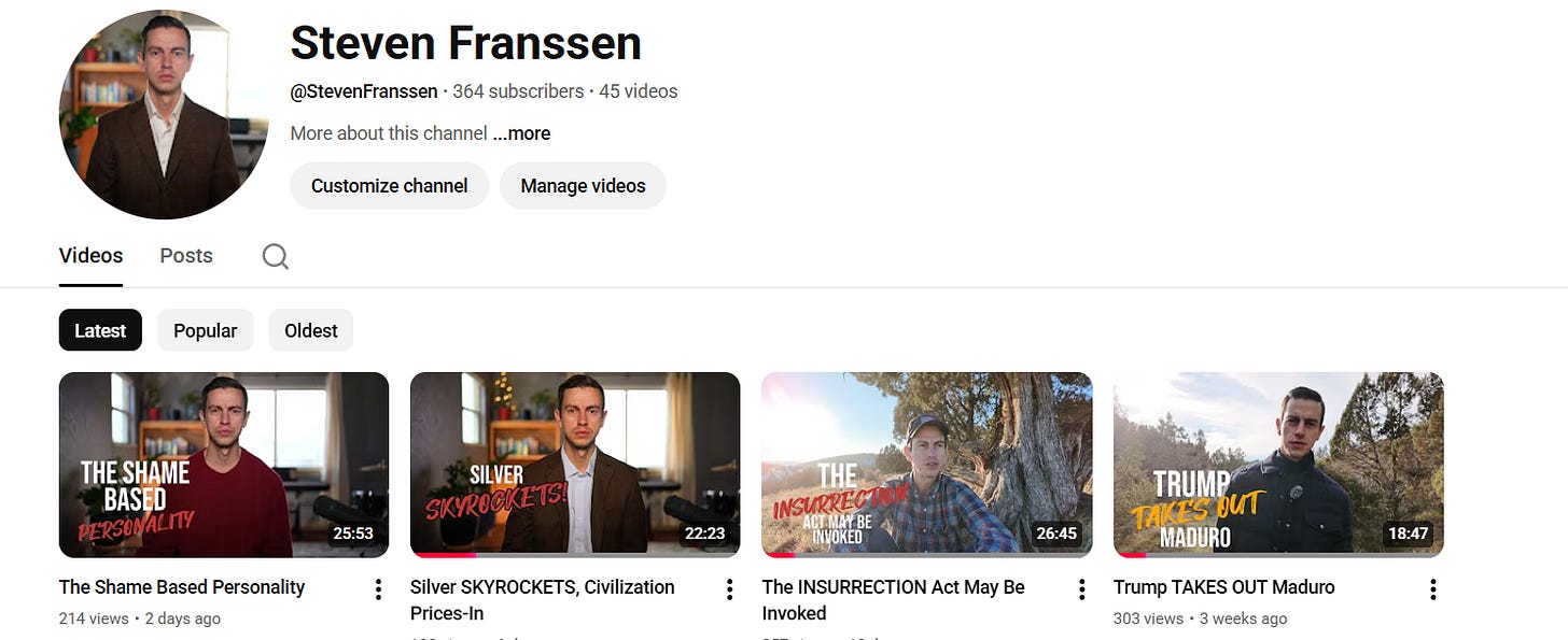 My YouTube is at 1/65th what it was at its peak, after being heavily supressed for the better part of three years before it was unceremoniously deleted by some woke, vicious Millennial staffer at Google.